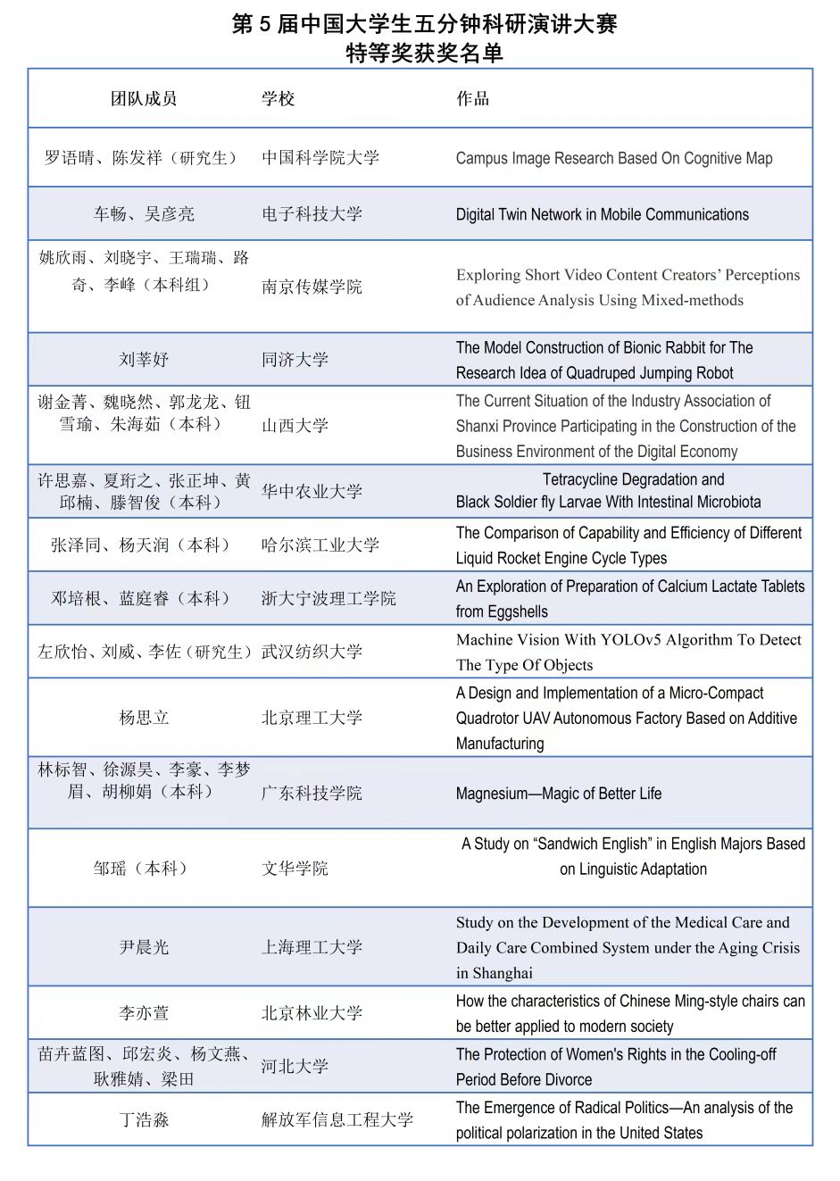 随着2022年8月12日和8月20日全国决赛的举办,历时将近半年、用英语陈述科研项目的第五届大学生五分钟科研演讲大赛落下帷幕。我校学子在本届大赛中取得了优异成绩。其中,来自机械学院的左欣怡同学及其团队成员刘威,李佐获得全国特等奖,其英语指导老师为中国竞彩 华敏、蔡倩老师,专业指导老师为马双宝、沈满德老师。来自电子与电气工程学院的石紫迪和些婧一同学获得全国一等奖,其英语指导老师为中国竞彩 的蔡倩老师。另外,还有其他来自管理学院,材料学院和化工学院的8位同学及其团队分别荣获全国二等奖和三等奖。特别值得关注的是管理学院研究生一年级的潘帆同学,在参加比赛时还是一名本科生。在其导师周新建博士的指导下荣获三等奖的好成绩。