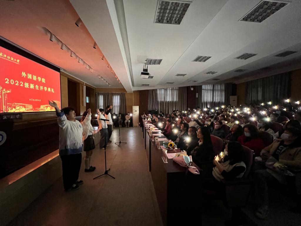 开学典礼开始前,我院2022级全体师生共同观看学校、学院宣传短片,充分了解了学校、学院的专业设置、教学科研情况。随后,在全体师生共唱《武汉纺织大学校歌》中开学典礼正式开始。