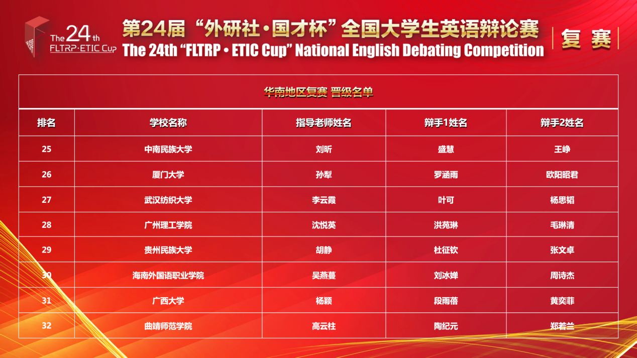 4月15日至16日,第二十四届“外研社·国才杯”全国大学生英语辩论赛华南赛区复赛在线上举行。此次赛事吸引了来自广东省、海南省、江西省、湖北省、湖南省、香港特别行政区、澳门特别行政区、台湾省等共计112所从校园选拔赛中脱颖而出的代表队。经过各高校代表队的激烈角逐,我校中国竞彩