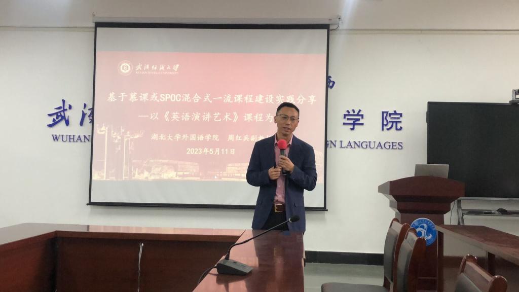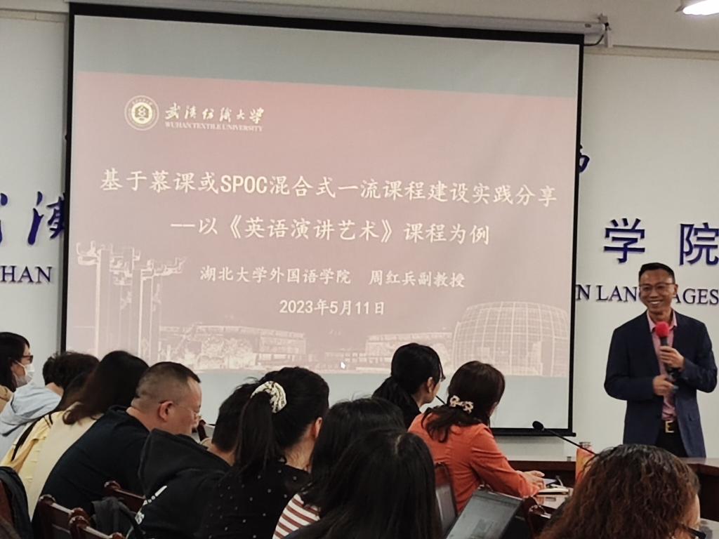 的周红兵教授为全院教师做了一场精彩的讲座,题目为:混合式课程设计的路径与教学创新手段提升的方法,讲座由副院长刘方荣主持。周教授是教育部本科线上一流课程及混合式一流课程评审专家,湖北省演讲协会英语演讲专业委员会主任委员,此次是受学院领导的邀请来作经验分享和课程申报指导,旨在提升学院的一流课程申报质量。