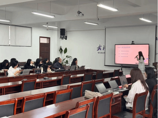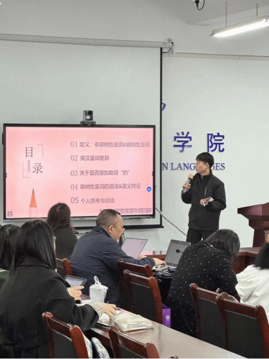 第二位汇报人为周华科。他分享的主题是“汉语空间容纳性量词考察及英译”。他首先区分非容纳性量词和容纳性量词的定义,然后进行例证。接着讲解是否添加助词“的”的各种情况。最后提出,容纳性量词的使用可以为语言表达增添更为具体和生动的信息,也从英译的角度进行举例说明。