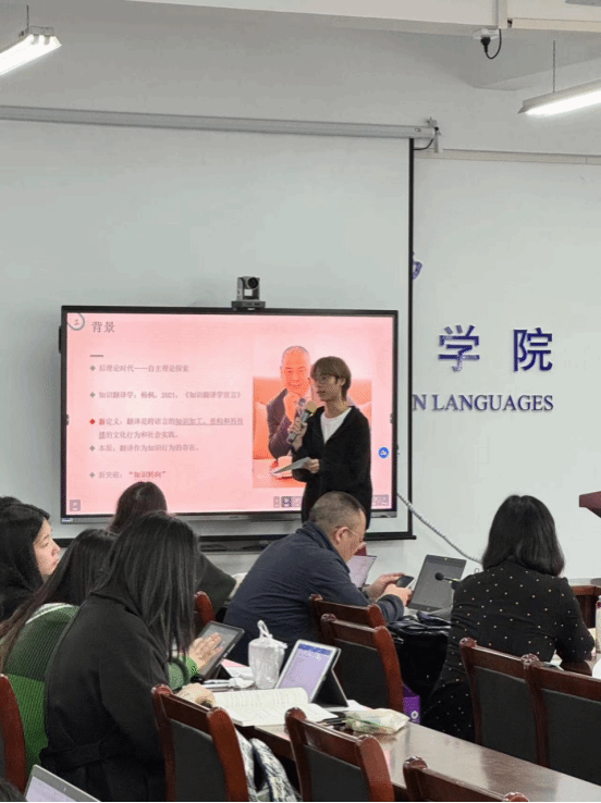 第五位汇报人为刘志豪。他分享的主题是“知识翻译史简介”。他从知识与翻译的关系、“学”与“史”的关系、知识翻译史的目标、学科价值和研究路径等方面进行介绍。他提到,在后理论时代,翻译被重新定义:翻译是跨语言的知识加工、重构和再传播的文化行为和社会实践。翻译是真理的传播者,是价值观共同体的打造者,是社会现实的建构者。最后他总结:只有先厘定基本概念,才能使知识翻译史建立在清晰的概念体系之上,并在确切的方法论指导下获得长足的进步与发展。