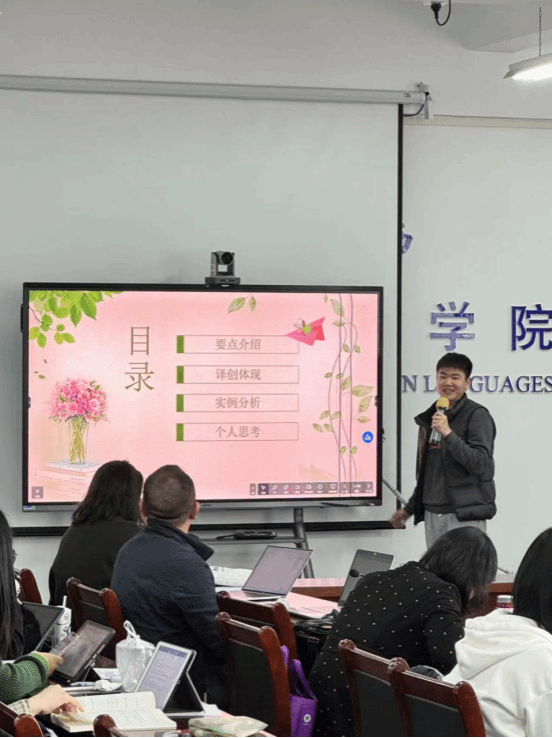 第六位汇报人为凡浩铭。他汇报的内容是“林语堂的《京华烟云》英文阅读分享”。他分析了林语堂作品受欢迎和传播广的三个原因:林语堂精通中西方文化、社会地位高;小说故事性强、语言幽默;生动形象地运用译创。然后他就作品中的具体实例,向我们展示了如何创译以及其优点。