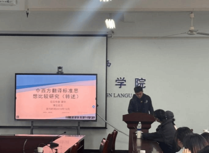 第二位汇报人展茂存同学分享了谭华博士的论文《中西翻译标准思想比较研究》(谭华,2019)。该论文比较了中西方翻译标准思想的异同,考察了造成双方翻译标准思想异同的根源,分析了双方翻译标准思想产生的影响。展茂存同学认真进行了讲解。
