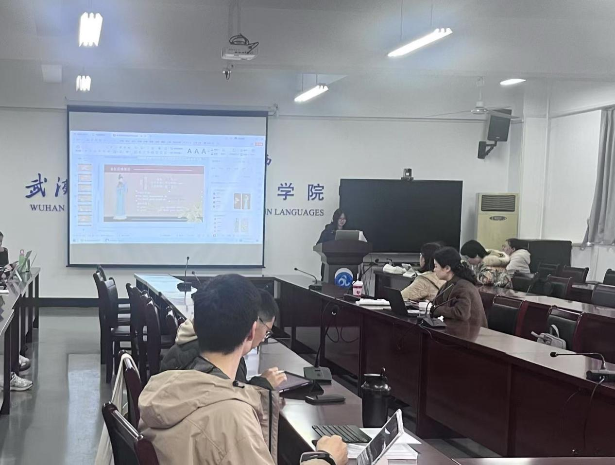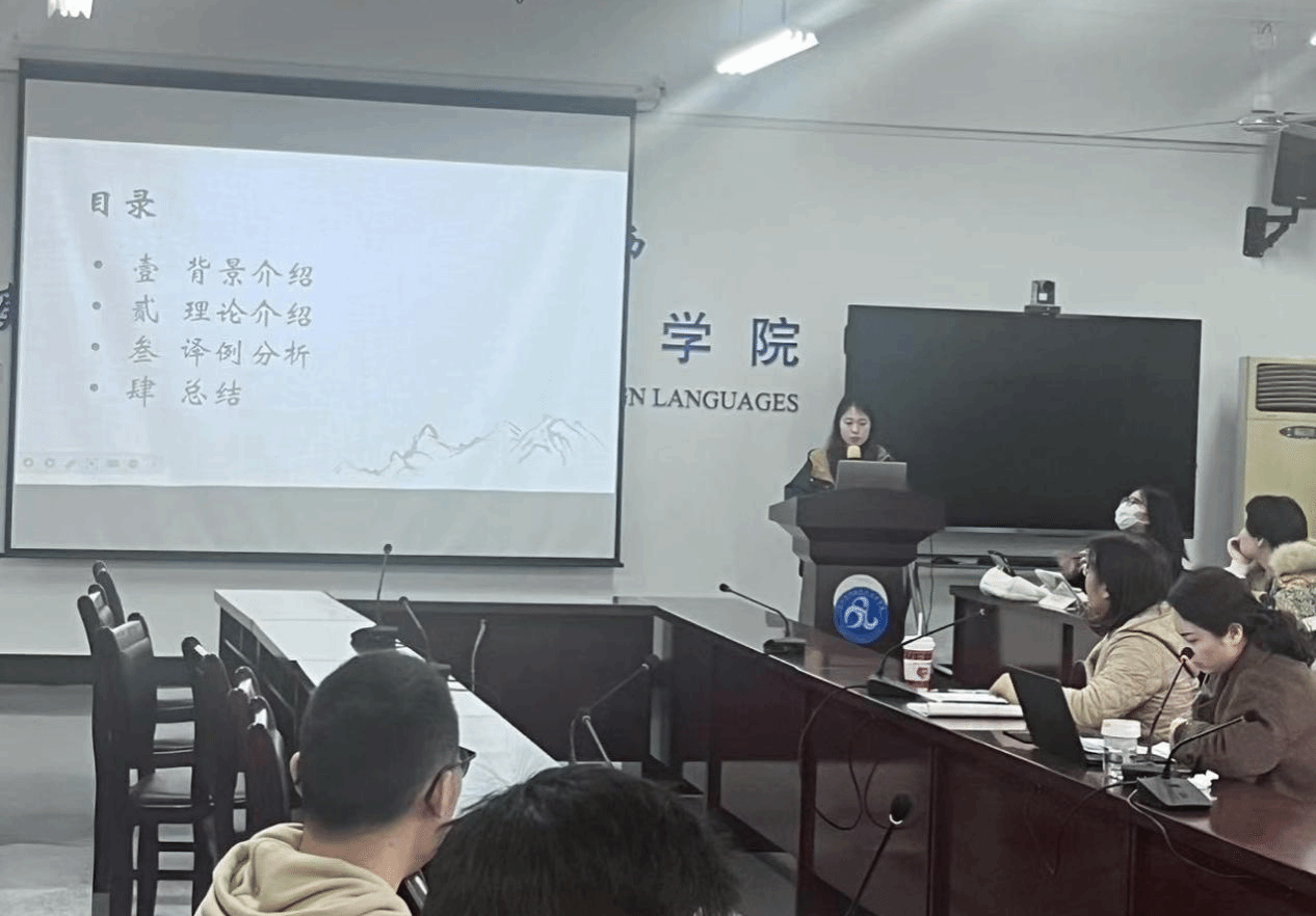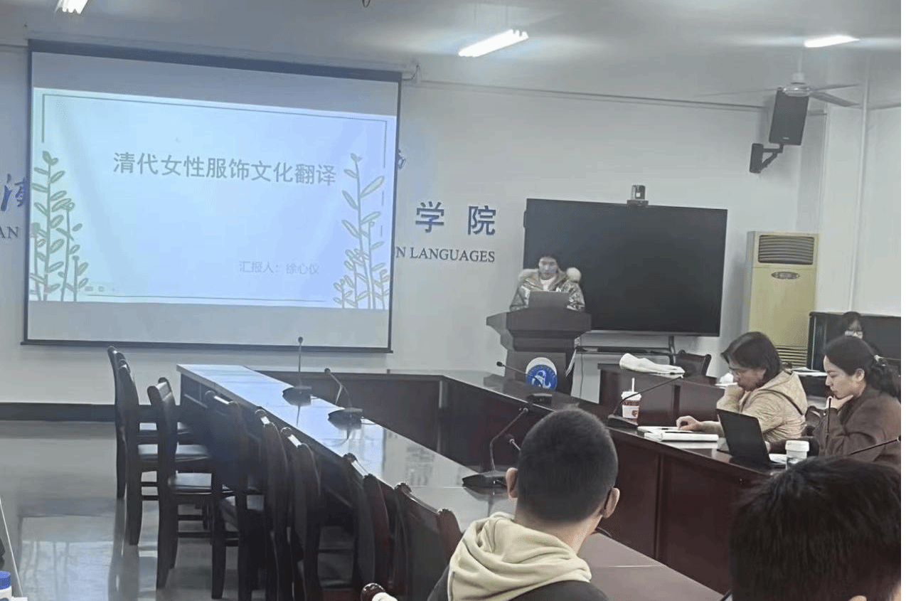 第二位汇报人李萌同学的主题是《文化翻译观视角下〈红楼梦〉杨译本服饰文化翻译研究》,她基于苏珊·巴斯奈特文化翻译理论,分析杨宪益、戴乃迭译本中服饰颜色、纹样、样式与材质的翻译策略。杨译本通过直译、意译、增译等方法,有效传递了传统服饰的审美意蕴与文化符号,如“石青”译为“slate-blue”“鹤氅”增注象征长寿内涵。该研究还发现中英文化差异导致部分文化功能等值不足的问题。李萌同学的分享结合音译加注、归化异化互补策略,深化文化阐释,为古典文学翻译与跨文化传播提供实践参考。
