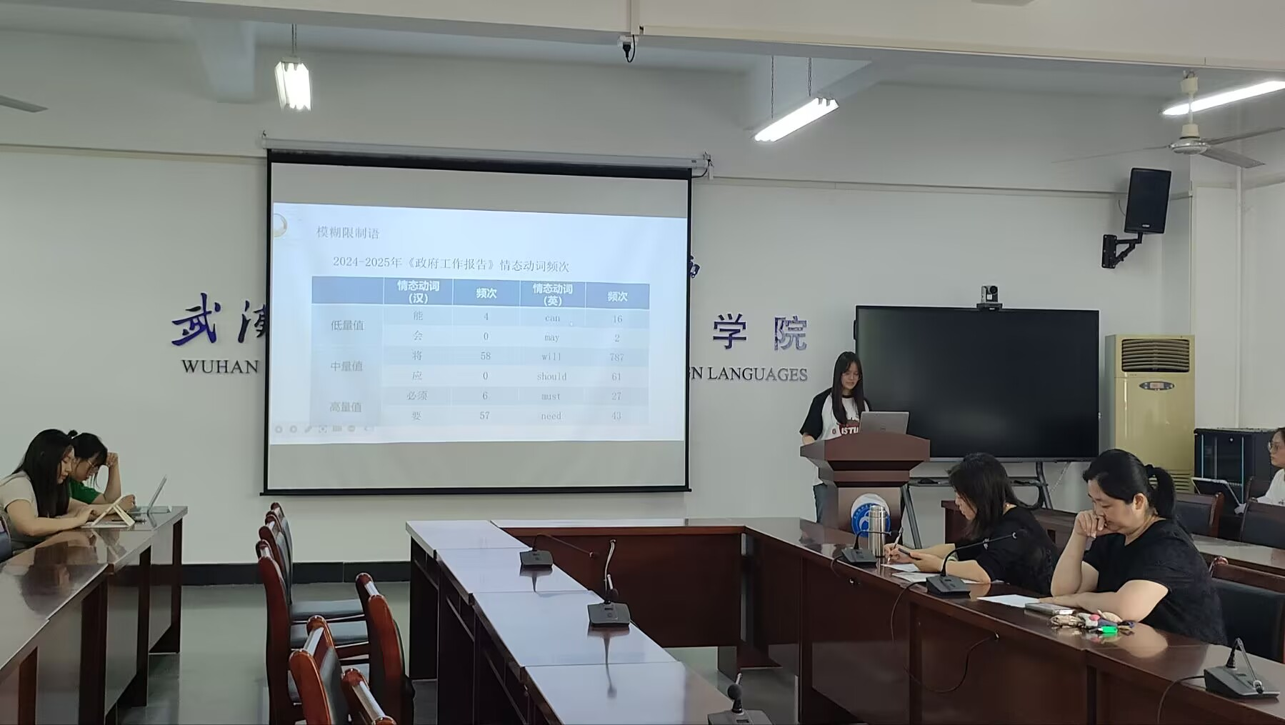 论坛由3名同学主讲。第一位主讲人是彭紫依,她分享的主题为《模糊限制语的翻译策略——以2024—2025年政府工作报告为例》。她通过数据展示了2001—2022年政府工作报告中模糊限制语的使用频率和类型,得出变动型模糊限制语的使用频率大于缓和型。她进一步分析了对等翻译法、词性转换法、语义转换法、删译法和增译法在翻译政府工作报告中出现模糊限制语的应用。
