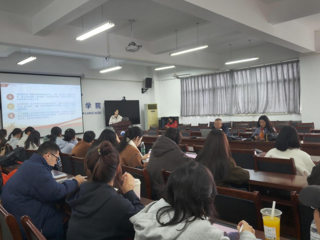 论坛伊始,2024 级 MTI 研究生吴紫睿以《生态翻译学视角下 2025 年〈政府工作报告〉(节选)英译研究》为题,开启了首场分享。她借助生态翻译学理论,选取政府工作报告中的若干案例展开分析,从词汇、句式、文化等多个维度探讨了生态翻译学在政府工作报告英译中的应用策略。她指出,在翻译过程中,不仅要精准传达原文的语义信息,还需充分考量生态翻译学所强调的“适应与选择”原则,使译文在目标语语境中达成最佳适应度,进而更有效地传播中国政府的声音与理念。
