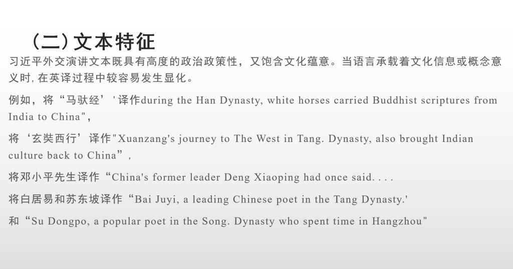 会上赵淑琴同学分享了名为“显化翻译策略的应用”的主题报告,分别从习近平外交演讲英译中的显化翻译现象以及显化翻译策略在电影字幕翻译中的应用这两个板块角度进行了阐述。在第一大板块中,赵同学着重介绍了模糊语,中国特色词汇,流行词汇,数字缩略语等词汇和四言词组的延展化翻译策略。对于汉语中的显有地域特色的复合句以及对偶句的显化翻译为同学们进行了逐一分析。最后,她以几处电影字幕片段中的翻译为例,对显化翻译在外宣中的运用进行了讲解。
