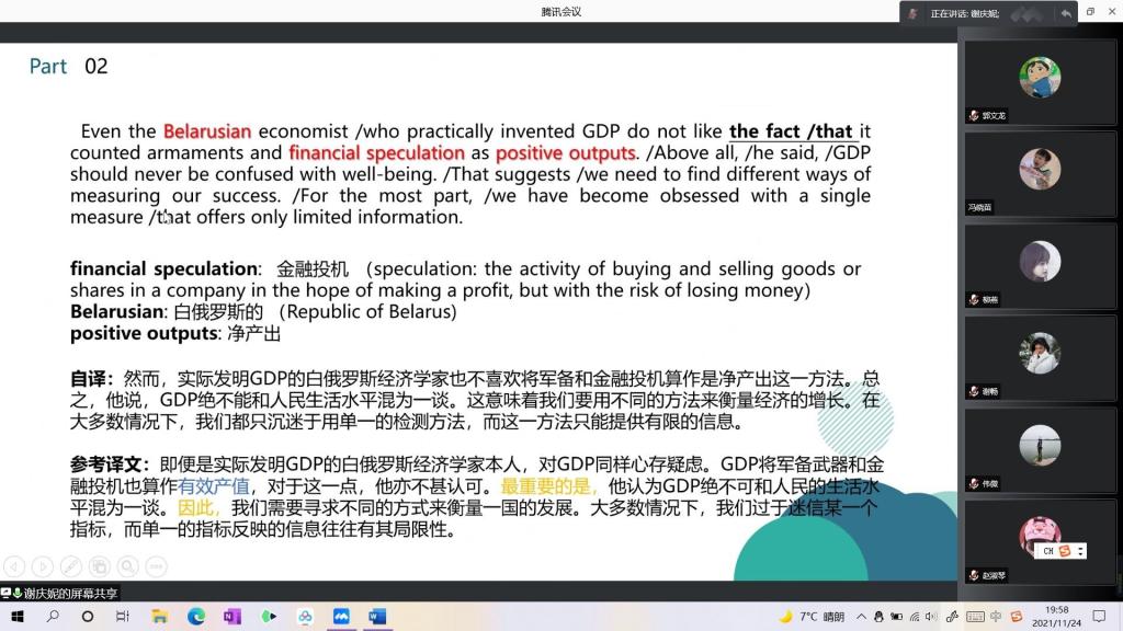谢庆妮同学分享的主题是“外刊翻译评析及《论英汉的时空差异性》”,内容主要分为两部分。第一部分是18年的二笔英汉真题,题为“Why GDP Is a Terrible Metric for Success and Wealth? ”该翻译练习角度新颖,从政经角度扩展了同学们的知识面,分享了一些政经概念和表达。第二部分,谢庆妮同学讲述了汉英对比分析,从时空性、被动式、主客体三个方面进行了阐释。两位同学的分享结束后,刘珊老师针对内容作了点评。对于顿新琪同学的分享,刘珊老师肯定了该同学的表达能力,认为该同学在讲述《如何撰写翻译实践报告》时分析地十分详细透彻,为21级学生提供了经验和方法。陈奇敏老师随后也提出了该同学的一些不足,例如对于文本中的一些抽象表达,可以结合例子去理解分析。对于谢庆妮同学的分享,刘珊老师认为该同学准备充分,但有些分析不够透彻,还有很大的进步空间。随后,赵伟老师和陈奇敏老师分别对谢庆妮同学表达了赞赏,赵伟老师认为谢庆妮同学很有想法,思维活跃,陈奇敏老师则认为其对参考译文的批判精神十分可取,值得大家学习。