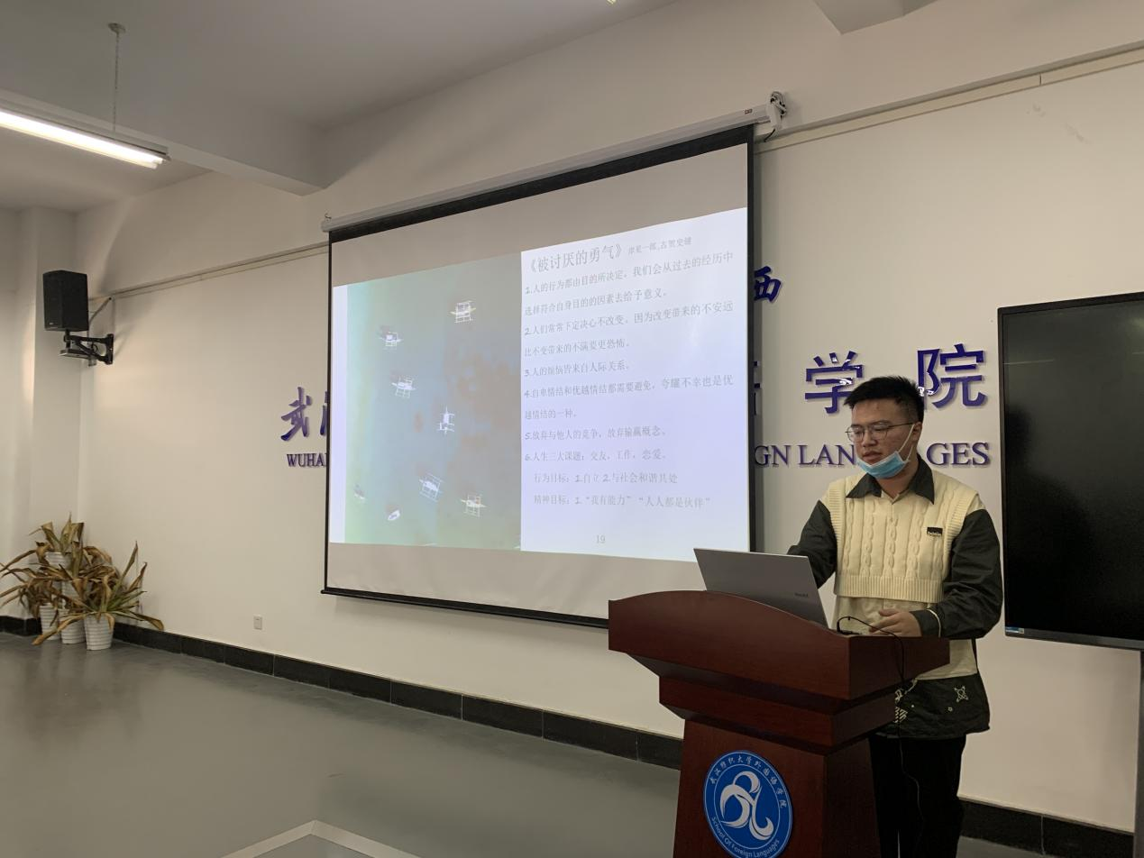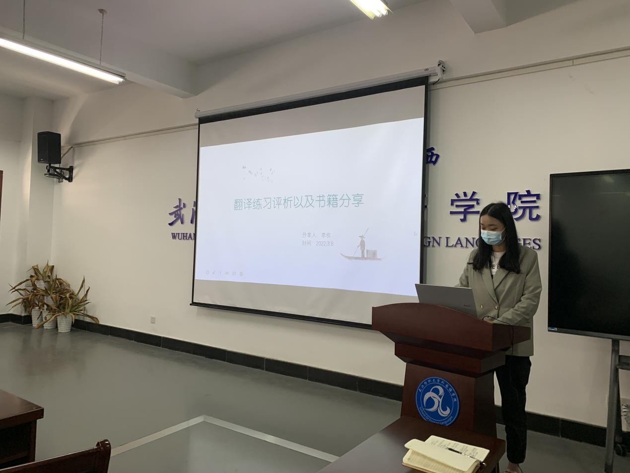 第二位汇报人李欢主题是“翻译练习评析以及书籍分享”。汇报分为两个部分,第一部分以“自然灾害”为翻译材料,将自己的译文与陈小慰的译文进行对比分析。分析完总结出:1.当句子过长或者修饰成分过多,调整语序必不可少;2.适当采取增译法使句子更加清晰流畅;3.为了句子内容衔接更为紧密,可以适当调整词语意思,对句子加以润色。第二部分主要介绍了福建师大学中国竞彩