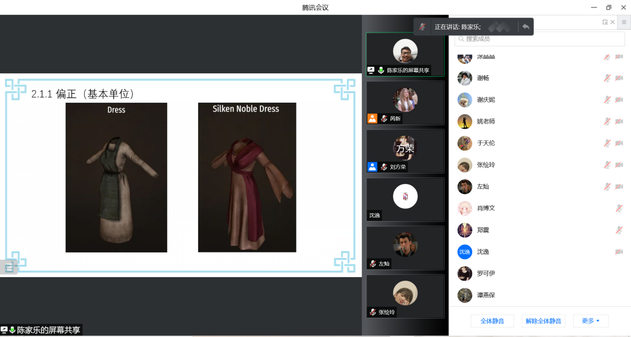 最后,呙新同学对于陈家乐同学第二部分分享的服饰词汇的偏正、并列、伴随结构等的分类表示疑惑,认为这一分类不具有典型性,不是游戏翻译所特有的。陈家乐同学指出自己对于游戏中服饰翻译的研究也是取之去现实的翻译,与其他各类翻译也有相通之处。