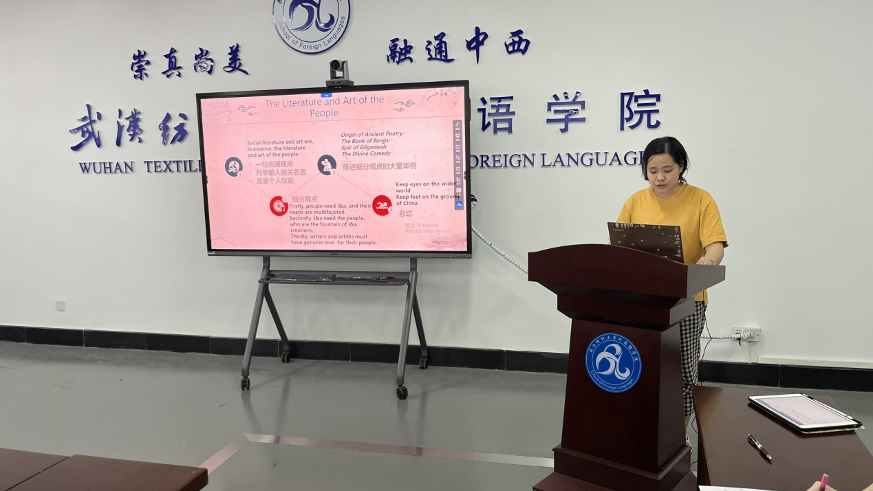最后,由指导老师进行点评。王辞老师指出翻译时,我们不能只看语法而忽略语义,词组构建时要看习惯用法和国际认可的用法,不能轻易用其他词代替。接着王辞老师分享了外宣文本的学习方法:多多关注领导人讲话,例如主席每年的新年讲话、政府工作报告等、保存官方译本、对其进行批注,形成常态化的学习习惯。接着陈芬博士对三位同学进行了点评。首先她对三位同学的分享进行了肯定,接着指出了三位同学在分享中需要注意的细节,例如标点符号,单词读音等细节。她还提到,在做翻译分析时要多方查证。陆雪芹老师也对三位同学行了表扬,但是她认为肖博文和张绘玲同学的分享没有理论支撑,提出巴斯内特“文化转向”概念可供参考,同时提出外文局黄友义副局长提出外宣翻译“三贴近”原则也可供参考,并且提醒张绘玲同学引用文献时要注意文献的时效性。和陆雪芹老师一样,刘珊老师也认为三位同学的选题具有重要现实意义,有利于培养青年的担当和使命,更好地服务于国家需求。但是她也指出了三位同学出现的问题。肖博文同学汇报首先标题和内容关联度有所欠缺,其次理论高度有所欠缺,没有分析译例的规律,副标题逻辑关系上不是并列的,并且逻辑结构不一样。对于张绘玲同学的汇报存在以下问题:首先,标题范围太大,可以适当缩小;此外,译例分析欠缺理论支撑。最后,她提醒郑震同学注意单词发音。最后由柯群胜老师进行点评,他指出了张绘玲同学的两个问题:(1)分享内容逻辑性不够强,一带一路和端午节连接比较生硬;(2)有些单词拼写错误,没有注意细节。他还指出肖博文同学也同样存在内容不够具体,没有体现出主体“文化自信”的问题。最后他引用习近平总书记关于青年工作的重要论述中的一句话,表达老师对同学们的期许:“广大青年要肩负历史使命,坚定前进信心,立大志、明大德、成大才、担大任,努力成为堪当民族复兴重任的时代新人,让青春在为祖国、为民族、为人民、为人类的不懈奋斗中绽放绚丽之花!”