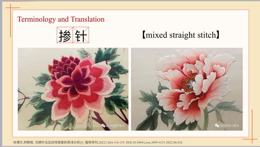 第二位汇报人秦笑眉同学分享的主题是湘绣。在对湘绣首幅人物题材的双面全异绣《杨玉环》进行简单的介绍后,她详细分析了关于湘绣的专业术语及翻译,如“鬅毛针”译为fluffy stitch、“蚁蠕针”译为worming ant stitch等。最后,秦笑眉同学为同学们讲解了湘绣和汉绣图案的差别并进行了总结。