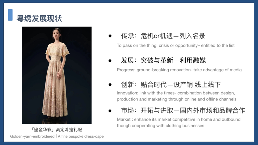 首先汇报的余意同学分享的主题是“粤绣(Yue embroidery)的非遗价值”。他将广绣和湘绣的刺绣工艺和风格进行了对比,并在技艺、构图、风格和适应材料方面对比了汉绣和粤绣。余意同学最后强调了粤绣传承的重要性。