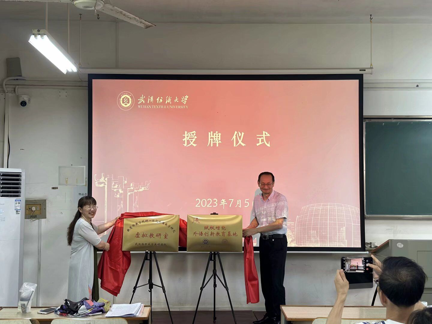 院长谭燕保教授共同为“教育部虚拟教研室武汉纺织大学教研团队”和“赋权增能外语创新教育基地”揭牌。在揭牌仪式上,谭院长感谢张教授对中国竞彩