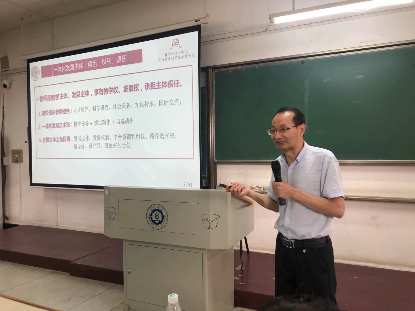 揭牌仪式结束后,张教授为研修班带来了题为“外语教师专业发展的课程教学与研究一体化路径”的讲座。他首先从国家教育的发展战略和高校教师的职业要求出发,指出了外语教师教学科研一体化的必要性。他说,教学和科研是天然的共生关系,两者相互促进。张教授以他践行赋权增能教学理念的经历为例,详细介绍了一体化的路径实践,总结了九条实践方案。为了保证实施的效果,他强调,教师要严格遵守“学习—思考—实践—提升”的原则。通过实践,高校教师首先要确立职业形象,厘清专业内涵,理解职业使命,明确高质量人才的培养目标,最后再据此设计教学方案。教学要紧紧围绕如何为学生赋权增能来展开并进行及时的反思,提升教学质量。张教授强调,无论采用什么样的实践路径,教师最终应该将学生培养成有人格魅力,有知识涵养,有学习能力和有良好素质的人。针对大家对教学实践如何转化为科研成果的困惑,张教授展示了近十多年他在赋权增能教学实践中产出的大量论文和各级项目。张教授强调,教学不可能是十全十美的,在实践中出现的问题和不足可以激发教师做科研的兴趣并提供有价值的科研选题。实际上,只要我们认真去做,教学科研是可以并行的,教学可以推进科研,科研成果可以反哺教学。讲座结束后,大家积极提问,张教授给予了详尽的解答。