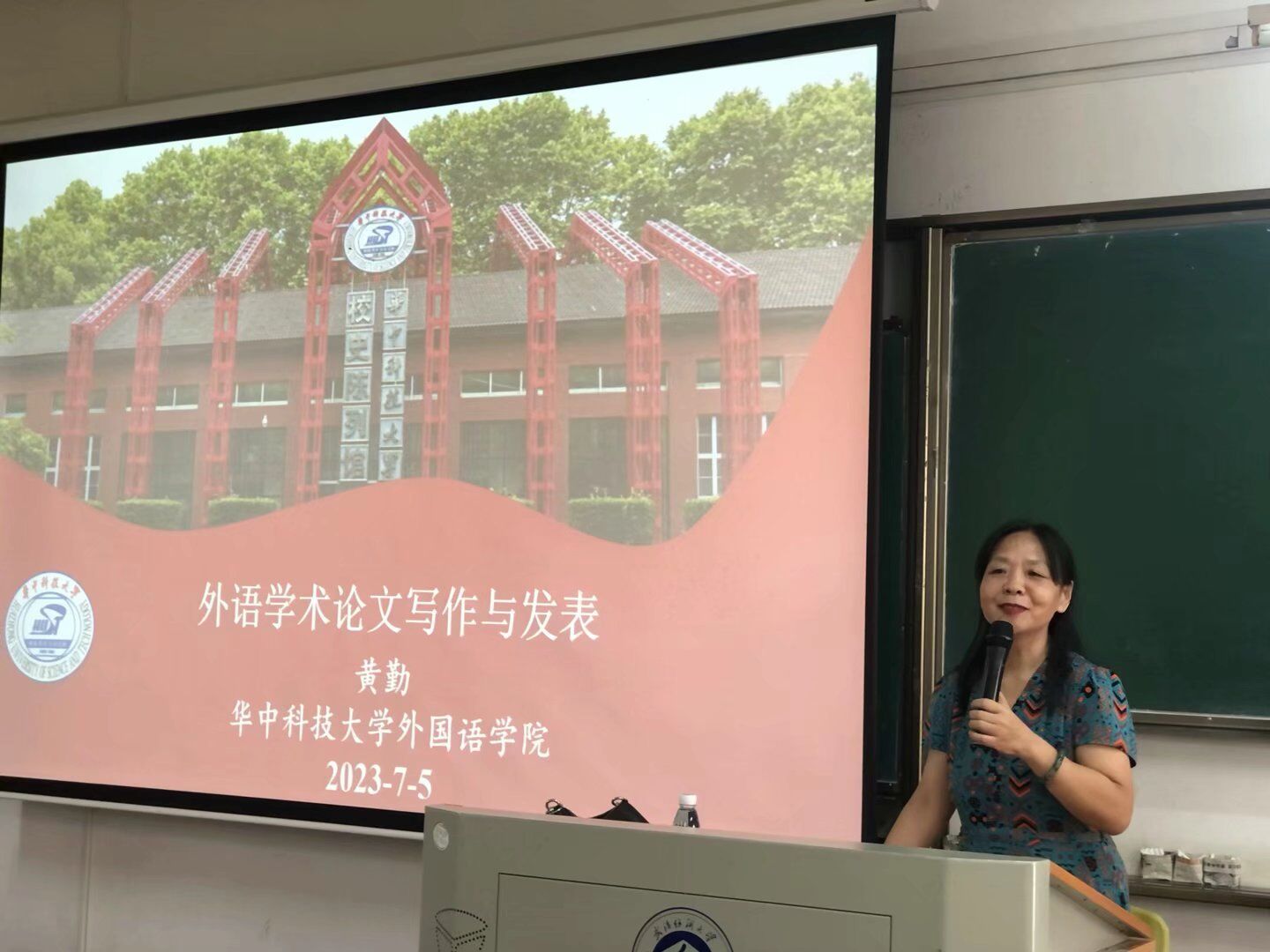 在下午的研修中,来自华中科技大学黄勤教授带领老师们了解外语学术论文写作与发表的途径和方法。黄教授首先从外国语言文学类的CSSCI期刊入手,详细分析介绍了各种期刊对选题的偏好,还包括投稿注意事项,及国际期刊投稿的网址。接下来,她分析了不同类型的论文写作特点及它们的优缺点。她说,不同的类型决定了论文的研究对象和研究内容是不同的。她鼓励科研基础较弱的老师可以从书评﹑文献综述等简单类型的文章入手。关于论文的选题,她给出了一些获取选题灵感的途径。她强调,确定选题前一定要大量阅读文献,包括:领域内经典著作﹑高质量论文﹑甚至是论文摘要。通过这样的阅读,研究者可以丰富自己的知识体系,跟踪学科研究前沿,了解他人的观点,从中发现研究的不足或缺陷,从而作为选题的依据。随后,黄教授从翻译的研究出发,介绍了七个论文写作的视角。她指出,有些视角是当前学界比较热门的,如:翻译史研究和翻译理论研究;有些视角是比较容易切入的,如:翻译教学和翻译方法研究。在谈到翻译研究方法时,她说,描述性﹑实验性和思辨性等三种方法都是非常可取的。其中,利用数据库来做研究是当前的热门,而思辨性论文最有难度也最有深度。紧接着,黄教授以访谈类论文为例,讲解了论文撰写的步骤及注意事项。她说,无论是哪一类论文,作者在写作前都要做好充分的准备,查阅资料,明确问题和研究内容以及研究方法。关于论文撰写,她还特别重视摘要的写作。通过正反案例,她强调,摘要是文章的精华,有自身的写作规范,要清楚地回答论文的目的﹑研究内容﹑研究方法﹑研究发现和研究意义。讲座的最后,黄教授说,翻译是一个实践性很强的活动,她建议从事翻译教学的老师要参与翻译实践,要以译促研,以教促研。黄勤教授在每一部分都有针对性地为大家列出了书单,鼓励大家要多读书,读好书,循序渐进地推进科研工作。黄教授的讲授内容具体详实,帮助大家更好地理解高质量论文的写作及发表。讲座结束后,大家踊跃发言,畅谈自己的听课感悟,专家也对老师的提问作了耐心的回答。