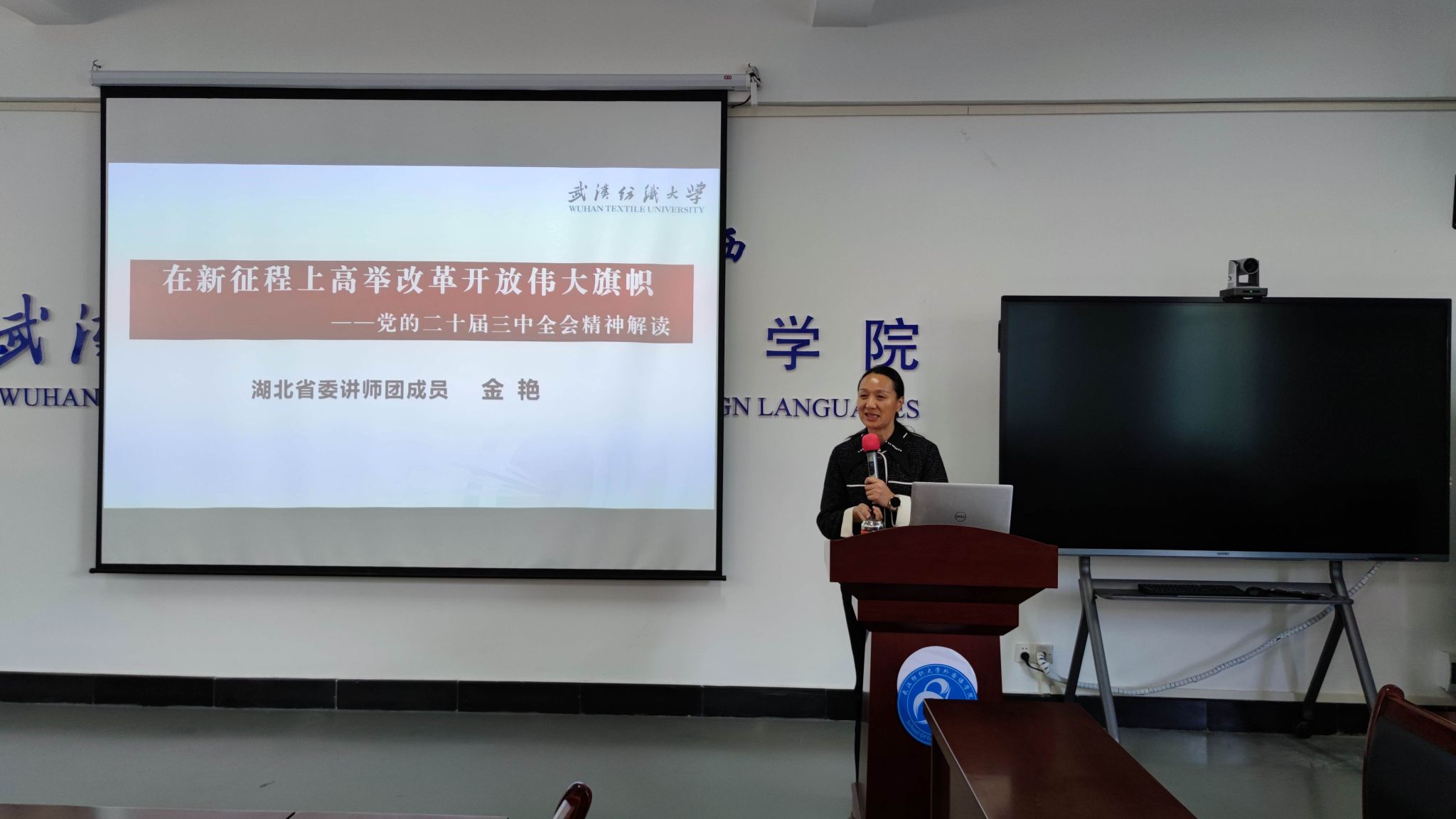 金艳强调,学习好贯彻好党的二十届三中全会精神是当前和今后一个时期全党全国的一项重大政治任务,全体党员要提高政治站位,深刻领会全会精神的丰富内涵和实践要求。她鼓励外语学院教师党员们要以身作则,将全会精神融入教学和科研工作中,培养具有国际视野和家国情怀的外语人才,让语言成为连接中国与世界的桥梁,为推动中国文化“走出去”战略做出积极贡献