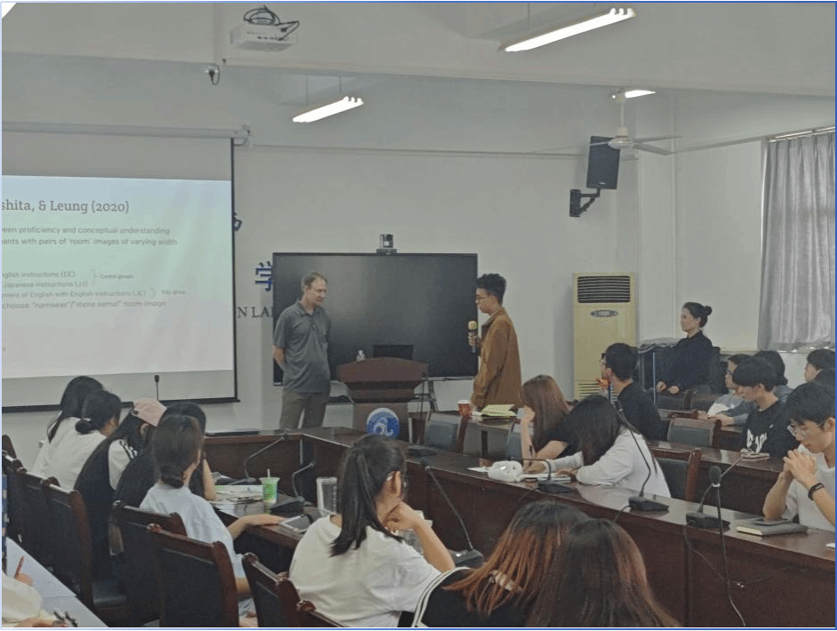 在讲座中,Brent教授首先介绍了学习者在学习第二外语时会出现的几种情况,如在二语学习中,学习者母语中的概念无法在目标语中找到对应的词汇与解释、母语和目标语无法完全对等表意等词汇学习困境。对此,Brent教授认为这是语言中的等效性(equivalent)问题,它一定会出现在学习第二外语的过程中。但也同时指出,这种现象会随着语言的深入学习而逐步消退。接着,Brent教授给大家展现了有趣的词汇学习实验,让同学们了解了词汇的学习与研究并非枯燥的,而是充满乐趣的。