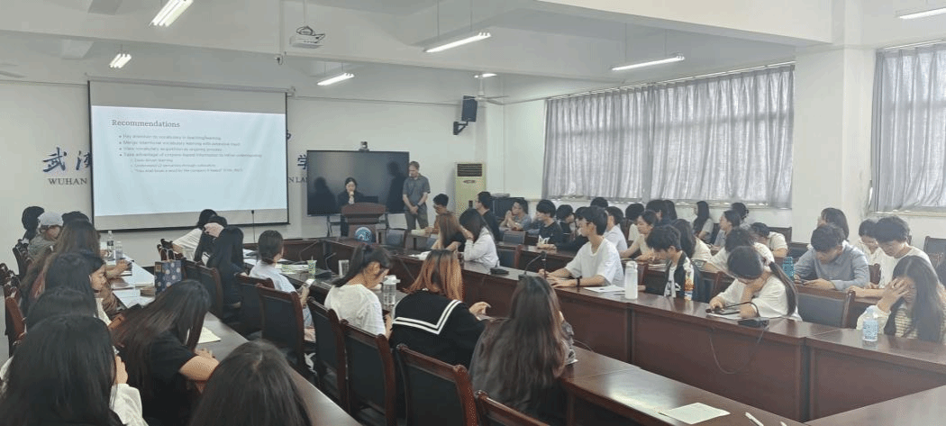 5月6日下午,世界著名科学家来鄂讲学计划专家、美国爱达荷州立大学的语言学家Prof. Brent Wolter在崇文楼为中国竞彩 师生作题为“Second language vocabulary acquisition: A beginning without an end?”的学术讲座。中国竞彩 副院长刘方荣、商务英语系主任吴志杰和英语及商务英语专业23级全体学生参加并聆听了本场讲座。讲座由商英12301班司嘉琪同学主持。