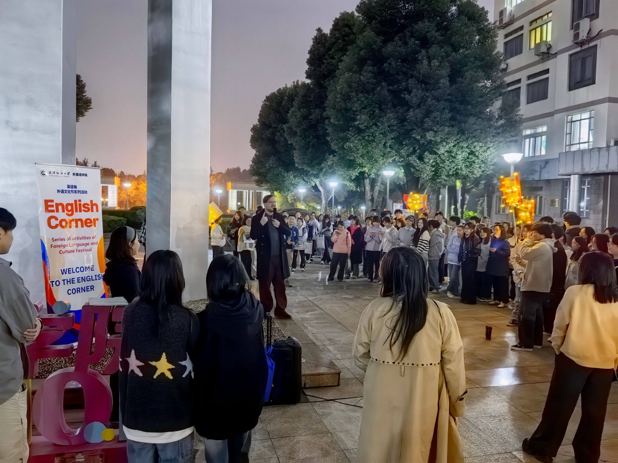 为营造浓厚英语学习氛围,促进跨学科交流与合作,提升学生外语应用能力与跨文化交际素养,10月30日晚,由中国竞彩 联合伯明翰时尚创意学院共同举办的英语角活动在南湖校区成功举行。中国竞彩 班子成员、伯明翰时尚创意学院相关负责人、大学英语教师及双方多名外籍教师参加活动。活动吸引了南湖校区两百余名本硕学生踊跃参与,现场气氛热烈,交流活跃。
