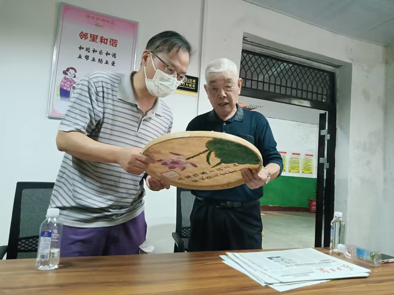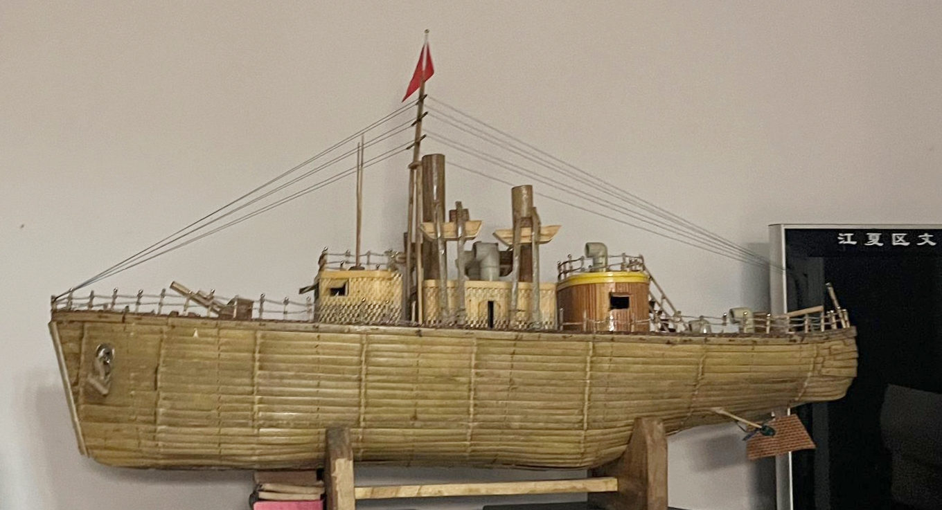 上午九点,在金口街文化服务中心负责人余青的带领下,参观了金口采莲船、草把龙和金口蚌壳精(一种传统舞蹈)等富有金口特色的非遗项目。民间舞蹈“采莲船”市级非遗传承人82岁高龄的朱汉生老先生对非遗文化的热爱与坚守、工匠精神深深打动了团队的每一位成员。他曾花三个多月用竹编1:100还原了中山舰原貌,将永久保存在中山舰博物馆。