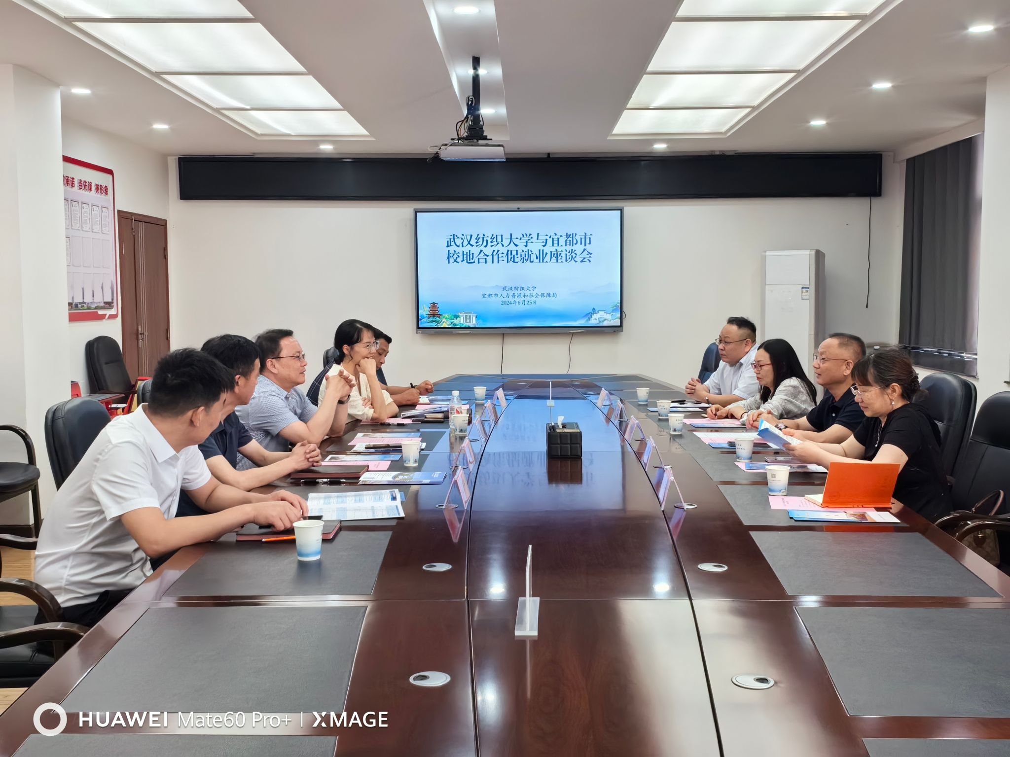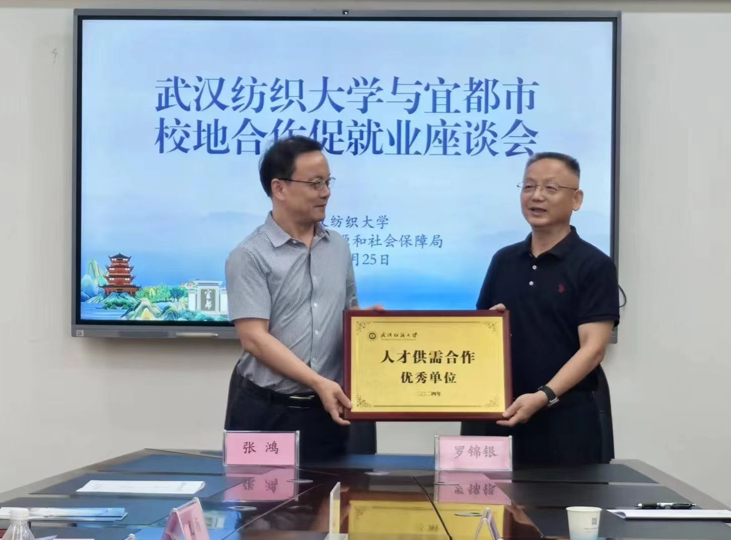 在宜都市人力资源和社会保障局,举行了校地合作促就业座谈会,开展武汉纺织大学“人才供需合作优秀单位”和宜都市“高校‘就业服务’联络站”签约授牌仪式,局党组书记、局长张鸿对罗锦银一行表示热烈欢迎,介绍了宜都“引才、留才、用才”的相关政策,双方就毕业生就业、实习实训等问题进行了深入交流。罗锦银表示,武汉纺织大学一直高度重视学生的就业问题,希望通过与地方政府、企业的合作,为学生提供更多的实习、就业机会。同时,他也希望宜都市人才部门能够加强与武汉纺织大学的交流合作,进一步擦亮“百强县市”金字招牌,深化校地合作、校企合作,吸引更多优质人才。宜都市人社局党组副书记、副局长吕俊杰和相关负责人参与座谈。