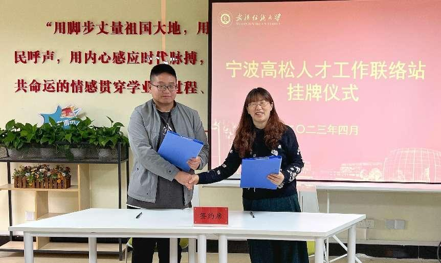 签订校企合作协议,一同为人才工作联络站揭牌。胡川回顾了与纺大的合作交流情况,结合外语、管理、经济、机械等学科特点,基于自身多年行业从业经验,系统讲解了电子和外贸行业发展趋势、职业发展特点及核心竞争力构成要素,诚挚邀请纺大学子在宁波展现聪明才智、实现人生理想。他表示,纺大的人才联络站是高松电子在湖北挂牌的第一家人才工作联络站,希望联络站成立后,在校企合作、人才招聘、实习实训等方面搭建更好的平台,实现更深层次的合作,优势互补、互利共赢。