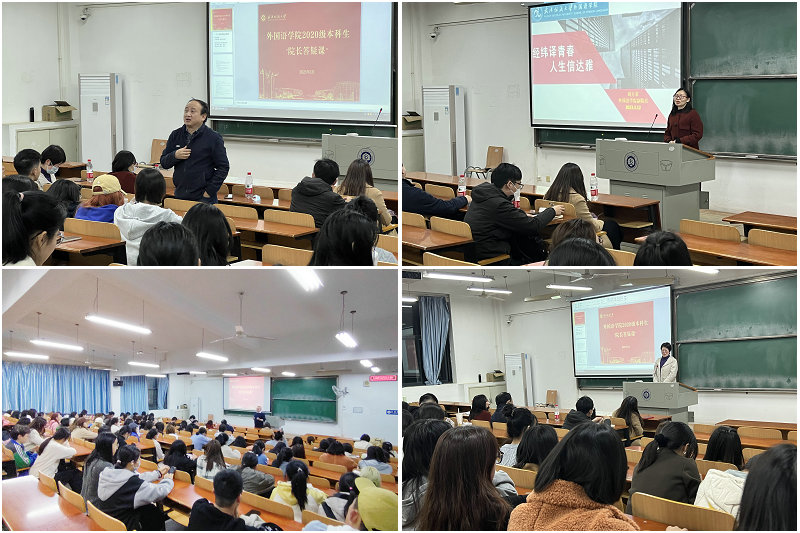 在答疑课的最后环节,副院长罗绮伦引用《The Road not taken》中的诗句,勉励大家尝试有挑战的路,不留人生遗憾。副院长刘方荣则介绍了学院MTI硕士点建设情况,鼓励大家积极报考。副书记彭阳慈航从坚定考研信心、做好考研规划、精准定位目标三个方面向进行了交流动员。班主任钱茂华和李顺亮老师分别现身说法,从自身的求学发展经历,引导大家以兴趣为导向,尽早着手准备。