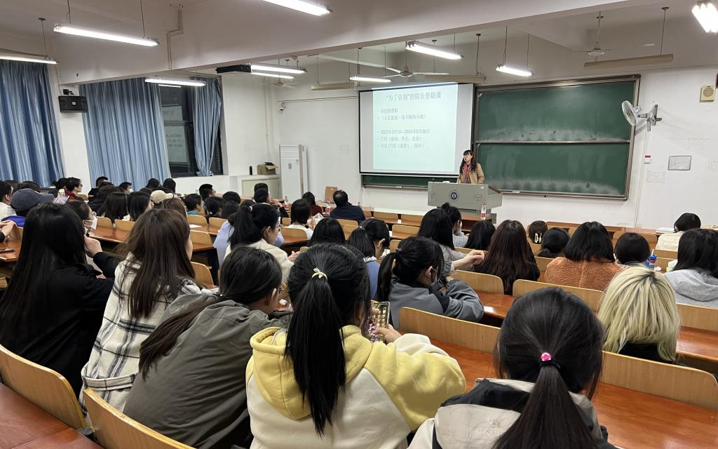 谭院长首先引导大家憧憬毕业时的场景,真诚希望所有毕业生都能奔赴光明的前程。随后让在场学生回忆去年答疑课以来,是否足够努力地学习专业课程、考取证书、参加比赛、积累经验,为自己的人生提供更多选项?她表示只有足够努力,才能在千辛万苦达成目标后云淡风轻地保持“内卷中的优雅”。