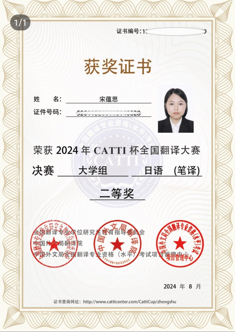 CMA12001班的宋蕴思同学,在初赛、复赛、决赛三轮激烈的竞争中表现出色,最终获得了2024年CATTI杯全国翻译大赛决赛大学组日语(笔译)二等奖。此次大赛的佳绩不仅展示了学校在翻译教育方面的实力,也激励了更多同学投身于翻译事业中。