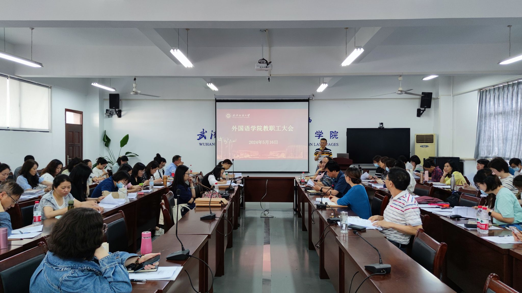 在04-303会议室召开全体教职工大会,开展政治理论集中学习,学院党委书记胡中原主持会议,全体党员教师、教职工代表参加会议。