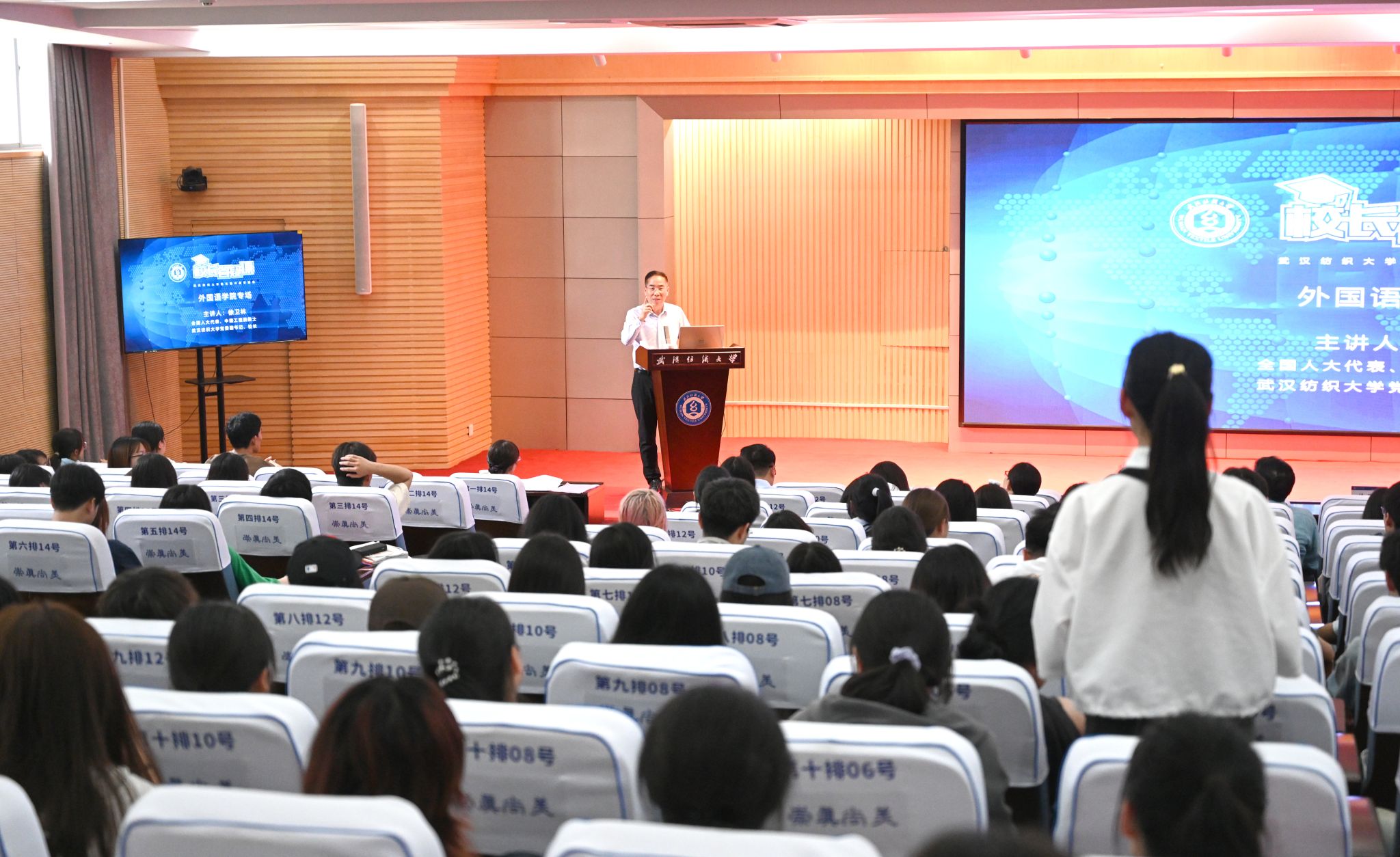 “我的经历和体会,英语给了我很大的帮助,英语非常非常重要。”徐卫林结合自身的成长,与同学们分享了自己和英语的故事。2008年在一次国际学术会议上的英文报告,助力他成为中国首位获得美国纤维学会杰出成就奖的学者,他坦言自己在用英语作报告时也会有压力。同时,徐卫林回忆起自己求学时取得母校英语最高分的往事,认为扎实的英语基础让自己在求学、深造、科研上树立了信心,提供了帮助。