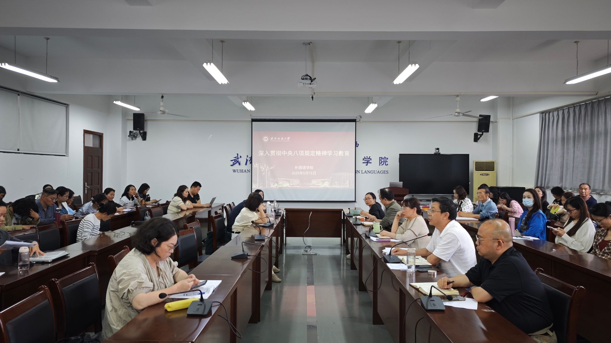 召开警示教育大会暨深入贯彻中央八项规定精神学习教育专题学习,党委书记胡中原主持会议,全体教职工参会。