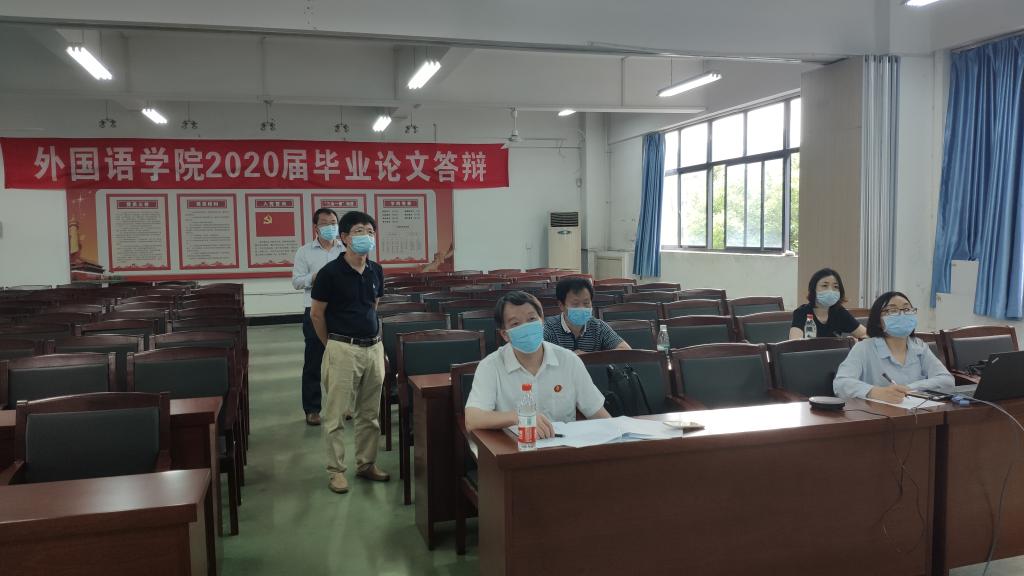 5月28日下午,受全球新冠肺炎疫情所致,在最大限度保障学生健康、安全及减少聚集的前提下,为确保我院2020届全体本科生毕业论文答辩的顺利完成,全体答辩人汇集云端,分别就各自的本科学士学位论文展开学理性论述,并就答辩组导师的提问展开理论性应处。教务处处长何畏到答辩现场对答辩工作进行了指导,本次答辩工作由学院教学副院长罗绮伦统筹协调,并由英语系副主任唐娴老师具体执行推进。