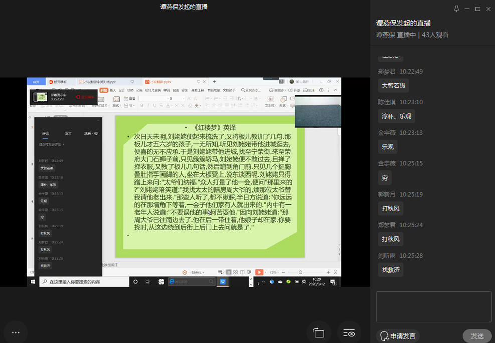 谭燕保教授的一堂“翻译名著赏析”给人印象深刻,从《红楼梦》人物性格分析,到翻译风格、翻译标准的诠释,再到翻译背景的欣赏,非常自然导入知识点,课堂设计精湛,近2小时的授课,从课前提前15分钟的NPR美国在线新闻热身,到课中知识点的导入,再到作业的布置,采用企业微信授课信息量大,与学生互动频次多,使学生感觉授课内容很有趣,获得感强,反映老师深厚的文学功底,授课精湛。