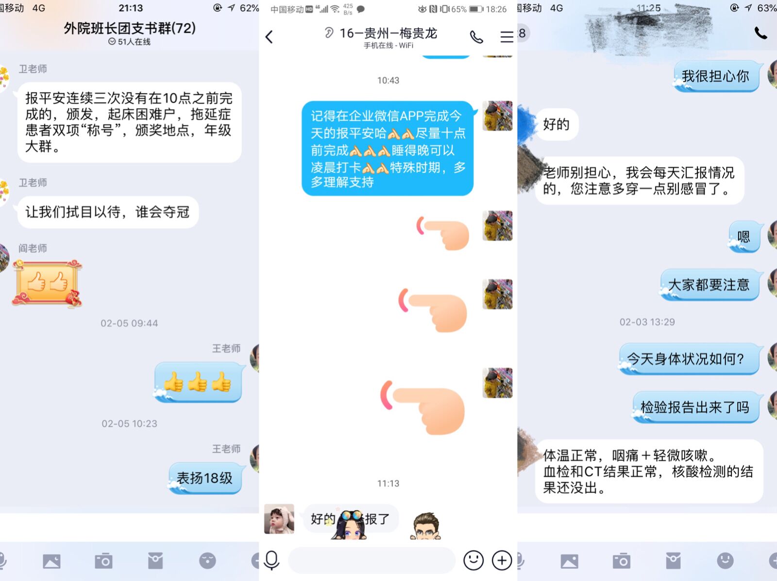 学生安全,不漏一人。根据学校统一要求,学院学工团队第一时间召开线上工作会议,充分利用企业微信“i纺大”平台,部署开展“日报平安”工作。通过年级动员、班级线上例会,督促外院学子每天按时报告个人身体健康情况,实现每日报告率100%,确保不漏一人。针对“发热”、“咳嗽”等特殊学生,辅导员开展密切追踪,及时介入,进行心理辅导,引导学生积极对待新冠病毒肺炎疫情。针对疫情引发的较严重心理问题和心理危机的学生,向学生提供心理援助服务,安抚学生情绪。