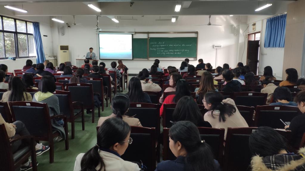 杨洪林教授从立德树人教育的根本任务和课程思政的意义出发,探讨了外语课程教学的特质和使命,详细阐释了外国语课程思政需正确处理好科学性与价值性、历史性与现实性、批判与继承、知识性与思想性、课程教学与科学研究等五大辩证关系。随后,杨教授分享了个人学术研究体会,开展理论研究既要能发现学术研究空白,也要服务国家社会发展需要,并分析了外国语学科理论研究应关注的课题,鼓励我院教职工研究创新课程教学,聚焦学术研究,要有自强不息、水滴石穿、持之以恒的精神。