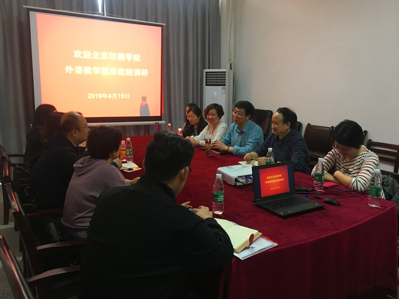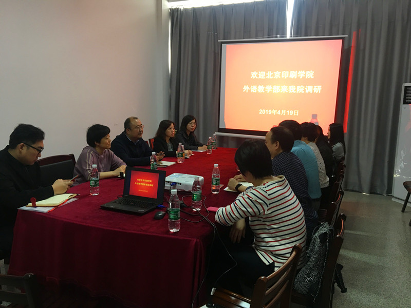 4月19日,北京印刷学院外语教学部书记杨雷一行五人来我院调研,学院党委书记胡中原、副院长罗绮伦、党委副书记王芳及各教研室主任参加了会议。