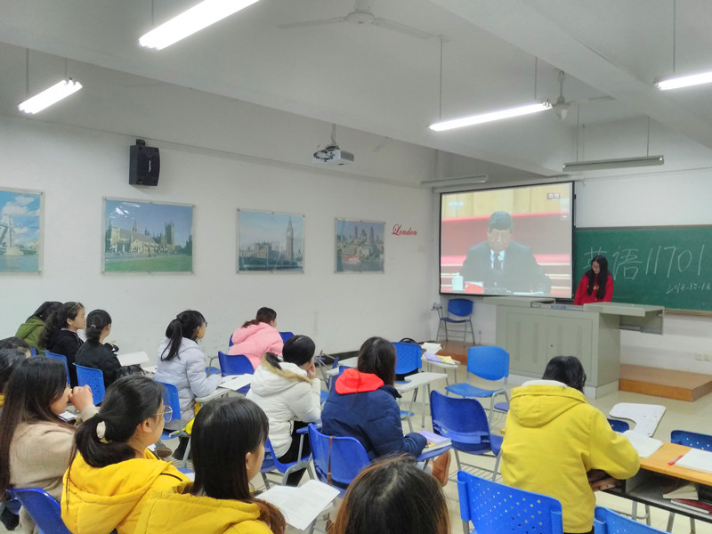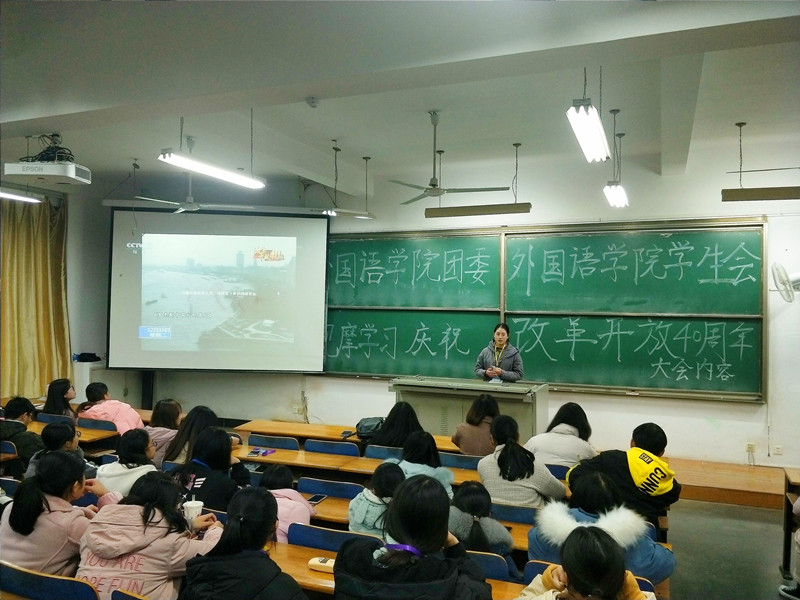 在7号教学楼127教室,英语11701班团支部围绕“庆祝改革开放40周年大会”开展主题团日活动。在观看完大会直播视频后,同学们积极发表观后感,团支书兼班长黄翠婷同学作总结。她说,改革开放如一把时间刻刀,深刻改变了我们的祖国,也广泛影响了世界。40年来,勤劳朴实的中国人民以大无畏的精神和无比坚韧的毅力,从无到有,聚沙成塔,推动中国驶上高速发展的快车道。改革开放正青春,青年学生当自强。