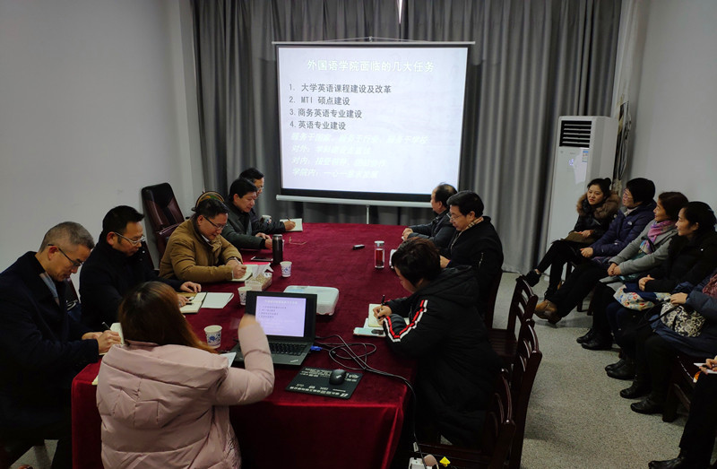 彭育园校长作总结讲话。他指出,到二级学院进行工作调研就是要总结工作、发现问题,然后以问题为导向,更好地规划2019年全局工作。很高兴看到外院党政班子团结有力,外院教职工认真务实进取,对学院目前存在的问题和差距分析到位,对未来发展规划清晰,着力准确,非常值得肯定。他强调,学校2019年将充分贯彻落实全国教育大会精神和新时代全国高等学校本科教育工作会议精神,紧扣“以本为本”,推进“四个回归”,聚焦本科教育和人才培养,优先完成本科资源配置。大学英语教学作为受众面最广的本科教学科目,对本科生人才培养质量提升具有重要作用。