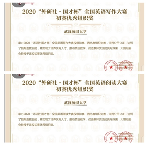 从各级领导,到专业教师,以及大学英语教师集体宣传和组织了这场赛事。因而,今年的三项赛事的实际参赛人数高达403人,其中非英语专业参与学生占比达40%。实际获奖人数总计141人次(见附件“2020外研社写作初赛获奖名单”和“2020外研社阅读初赛获奖名单”)。本次比赛总体成绩获得了质的飞越,如写作满分100分,赛后成绩60分以上达127人,占比实际参赛人数91%;阅读大赛难度非常大,获奖人数则达81人,分数60分以上占实际参赛人数40%。 商务英语专业的江琦和莫雨童同学分别荣获写作、阅读校园初赛的特等奖,并代表本校参加将于11月7日在中国地质大学举办的省级复赛。