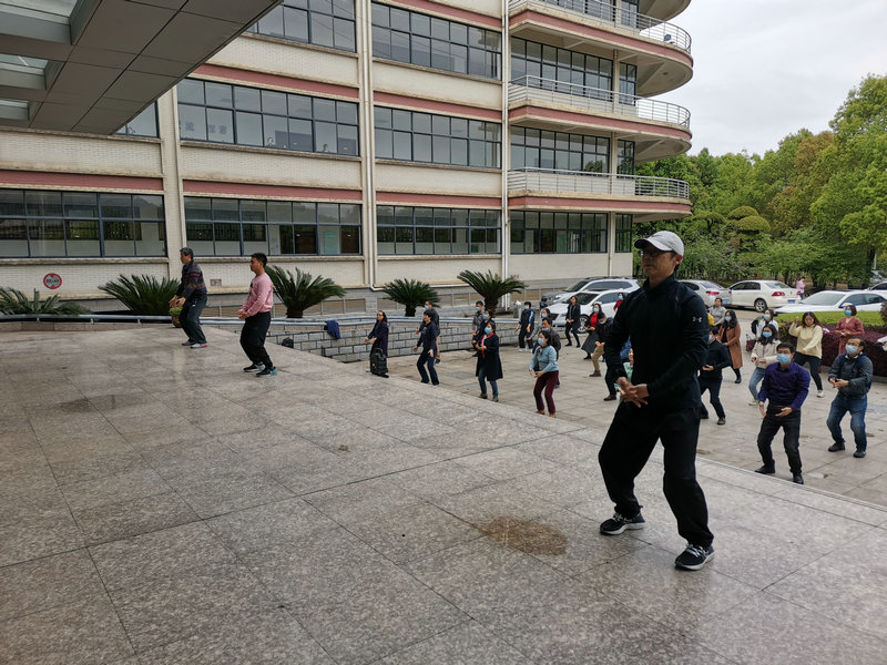教职工则排成队列,饶有兴致地跟随练习。“双手托天理三焦、左右开工似射雕、调理脾胃臂单举…”一套动作下来,老师们感觉身体各个部位都得到了充分的调动和锻炼,血液循环明显加快,气血慢慢通畅。
