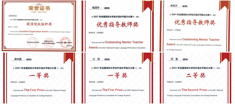 积极组织英语和商务英语专业2018、2019两个年级共301名学生参加初赛,初赛成绩前十名参加全国决赛,其中9名学生在决赛中获奖,包括一等奖2名、二等奖4名、三等奖3名。商英11901班梁沐葳名列全国第8名,是武汉参赛学校中的最好成绩。英语专业钱茂华老师、商务英语专业余桂兰老师获得“优秀指导教师奖”,我校获得“最佳组织院校奖”。