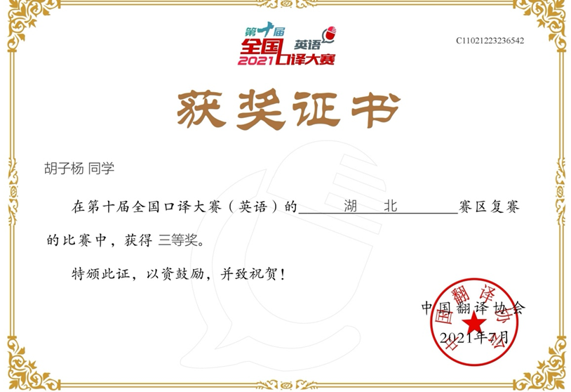 2021年6月12日至13日,第十届全国口译大赛(英语)湖北赛区复赛如期举行。第十届全国口译大赛(英语)是有中国翻译协会主办,由于疫情关系,此次省级区域复赛采取线上比赛模式。经过前期选拔,武汉纺织大学共13位同学初赛晋级复赛。此次复赛汇聚了武汉大学、华中科技大学,华中师范大学等数十所高校本科生和研究生参加,我校中国竞彩