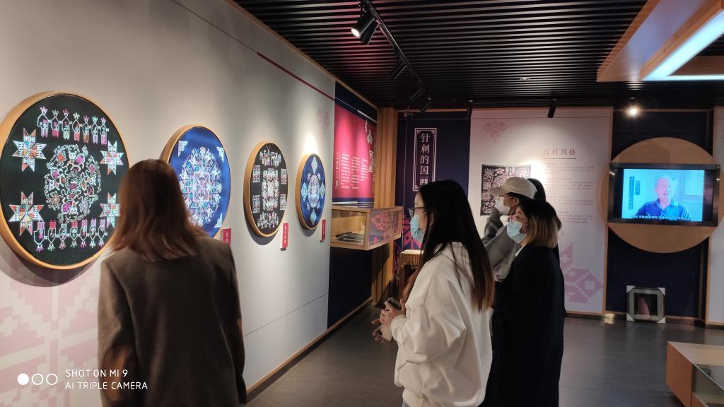 在参观过程中,同学们被图案精美、色彩绚丽,有浓郁地方风格和民间特色的展品深深吸引,纷纷驻足停留、拍照。在欣赏展品和观看展馆视频的同时,同学们加深了对教材中汉秀、土家织锦(西兰卡普)、蓝印花、手工织机的理解,领略了丰富多彩、弥足珍贵的纺织类非物质文化遗产。