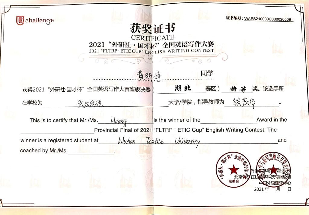 2021“外研社·国才杯”演讲、阅读、写作大赛自今年6月启动报名,历时将近5个月的时间,已经顺利完成校园初赛、湖北省复赛。在湖北省决赛中,我校计算机与人工智能学院20级学生袁嘉昊获得阅读大赛二等奖,商务英语专业19级学生黄昕婷以第一名的成绩斩获写作大赛特等奖,直接晋级国赛,将代表武汉纺织大学参加于12月8日在北京举办的全国总决赛。