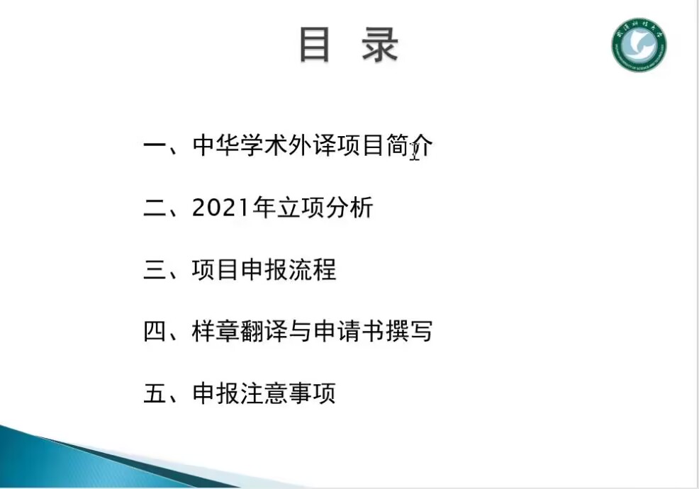 李教授首先鼓励大家要克服畏难情绪,多关注申报信息和申报选题。她说,结合自己的专业背景,中华学术外译项目是值得我们普通老师去尝试的高级别项目。李教授的讲座内容分五个部分展开:项目介绍﹑立项分析﹑申报流程﹑样章翻译与申报书撰写以及申报注意事项。通过立项分析,她强调,遴选的外译著作一定要能代表中国当代的发展特色和优秀的传统文化,且已经有一定的影响力。她的经验是:主动与知名出版社出版的名著作者联系会增加中选的概率。在介绍申报流程的时候,她指出,在充分了解项目申报各项细则之后,课题组的组建也值得我们注意。她区别了主译和次译两个角色,并对主译的要求作了进一步的说明。她说,主译最好同时是主持人,如果不是就必须为掌握汉语的目的语人士,这会增加项目申报的难度。另外,目的语校审一定要找目的语国家该领域的权威人士,这会提升译作的质量,增加评委对项目的认可度。在讲座中,李教授讲得最为详细的内容就是样章翻译。她提醒大家要关注细节,包括翻译的字数﹑样章的内容以及译文的质量等。她说,样章翻译是项目审核的核心指标,关系项目能否申报成功。她建议大家选择原著中有代表性的章节,并请目的语国家的华人教授逐字校对。在讲座结束之前,李教授再次勉励大家做好翻译实践,积累经验,中华学术外译项目就不是我们够不着的天花板。
