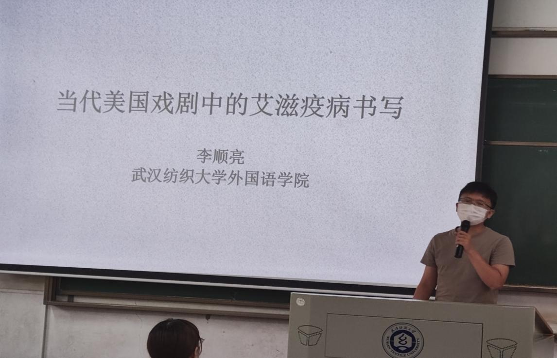 最后汇报的是李顺亮博士。他分享的题目是:当代美国戏剧中的艾滋疫病书写。他首先谈到了艾滋疫病的历史背景。接下来,他结合戏剧文本,描述了在疫情传播的过程中美国政府和社会的态度。他指出,美国媒体对艾滋群体的污名化,普通民众的漠视和群体内部的争端使得该群体面临艰难的伦理选择。通过对这个特殊群体的研究,李博士认为,在疫情面前,无论是什么样的人都应该坚持正确的伦理观,一方面要与不公正的政府和社会权威作坚决的抗争,另一方面也要勇于承担社会责任与本我达成内在的和谐。