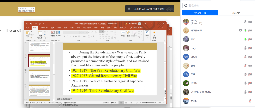 本次在线课程建设会议是继暑期课程建设启动会议后的第三次会议,与会教师结合自己的前期课程建设进展、课程资料准备情况进行了介绍。常沛教授从专业角度结合自己的线上课程建设经验,从思政课程的理论素养、用语规范、话语体系、刚性说理和柔性表达的融合等方面建议外语教师在讲授课程思政类外语课程时,在坚守政治立场、探求理论根源和构建知识图谱中把《习近平谈治国理政》的思想、理论、语言艺术等讲清楚、讲生动、讲深入,同时联系实际、实践、现实问题、国际情势等把课程思政讲活、把思政理论讲透、把用英文讲好中国故事、用英文弘扬中华优秀传统文化落到人才培养的实处、站到国家发展的高处。